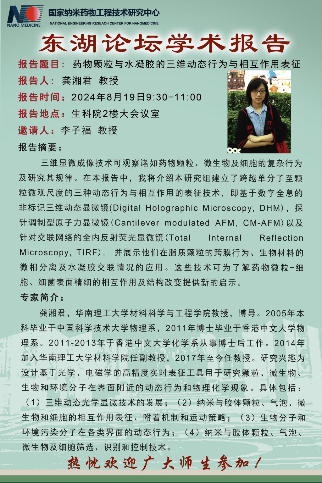 龚湘君,华南理工大学材料科学与工程公司教授,博导。2005年本科毕业于中国科学技术大学物理系,2011年博士毕业于香港中文大学物理系。2011-2013年于香港中文大学化学系从事博士后工作。2014年加入华南理工大学材料公司任副教授,2017年至今任教授。研究兴趣为设计基于光学、电磁学的高精度实时表征工具用于研究颗粒、微生物、生物和环境分子在界面附近的动态行为和物理化学现象。具体包括:(1)三维动态光学显微技术的发展;(2)纳米与胶体颗粒、气泡、微生物和细胞的相互作用表征、附着机制和运动策略;(3)生物分子和环境污染分子在各类界面的动态行为;(4)纳米与胶体颗粒、气泡、微生物及细胞筛选、识别和控制技术。