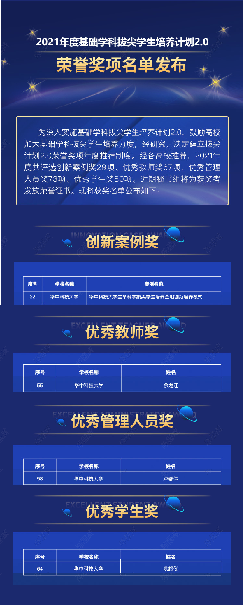 会上,清华大学、浙江大学、南京大学、上海交通大学作为秘书组单位,分别介绍了2021年工作进展和2022年工作安排。大会同时开展了拔尖计划2.0首届荣誉表彰,共评选出创新案例奖29项、优秀教师奖67项、优秀管理人员奖73项、优秀员工奖80项。公司申报获得荣誉奖项共5项,其中yl7703永利获得4项,分别是2021年度创新案例奖1项(案例名称:华中科技老员工命科学拔尖员工培养基地创新培养模式)、优秀教师1人(余龙江)、优秀管理人员1人(卢群伟)、优秀员工1人(洪超仪,生命基地)。