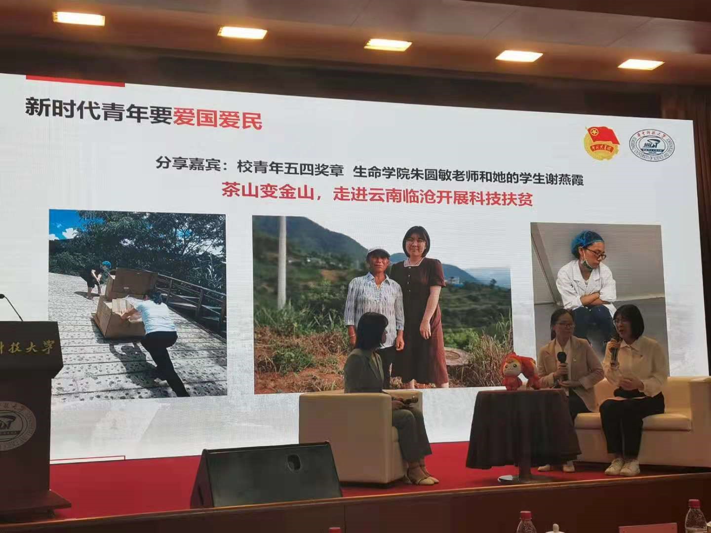 在五四表彰大会颁奖仪式后,校青年奖章获得者、公司青年教师朱圆敏老师以及湖北省向上向善好青年候选人、公司研究生谢燕霞同学在“让党旗高高飘扬”华中大青年说活动中讲述了公司师生坚守云南临沧扶贫一线,用科学技术将小小茶叶变成致富金叶的动人事迹。