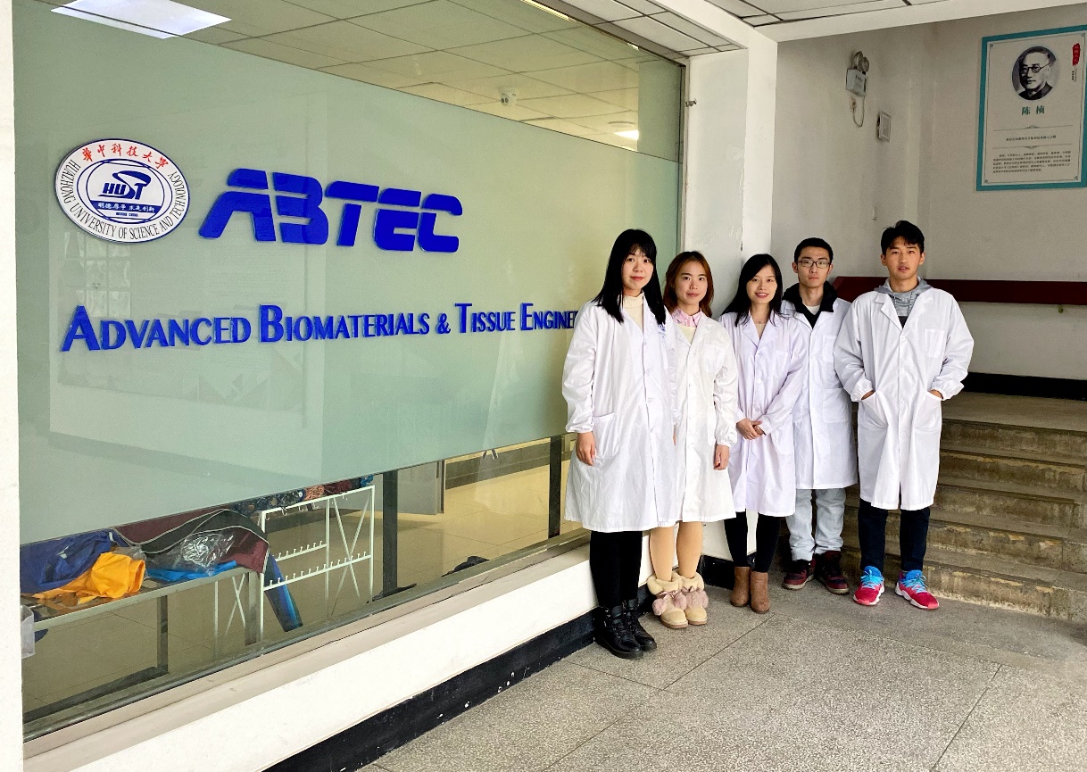 第四届全国老员工生命科学竞赛获奖队员方天怡、朱泓虹、于海升、张恩华在先进生物材料与组织工程中心(ABTEC)合影(中:指导老师杜莹莹)