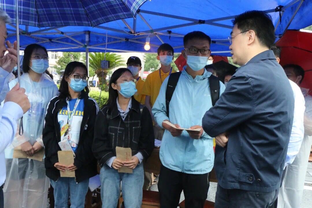 10点20分,公司党委书记邵新宇、副董事长梁茜来到迎新点,与员工和家长互动,看望新生,送上祝福,欢迎大家的到来。邵书记亲切问候到了公司来自葫芦岛的大一新生蔡树坤。