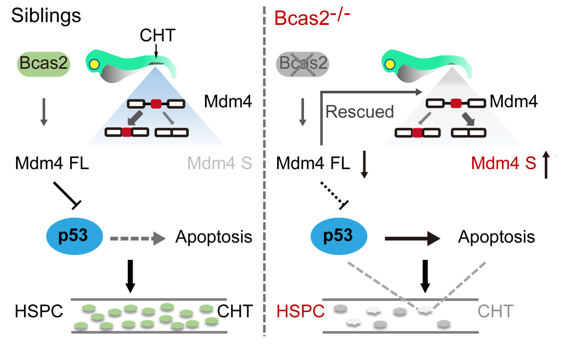 为探讨BCAS2在体内的生理功能,刘木根课题组和武汉大学罗大极副教授合作,应用基因编辑技术构建了BCAS2斑马鱼基因敲除模型。在斑马鱼中BCAS2与造血干细胞存在共定位,敲除BCAS2导致斑马鱼次级造血干细胞的形成显著减少。分析造血干细胞发育和分化异常的分子机制,他们发现BCAS2突变导致p53及其下游靶基因的表达显著升高,进而促进造血干细胞发生凋亡。进一步机制研究发现BCAS2参与MDM4的剪接,在斑马鱼中敲除BCAS2引起MDM4基因第6外显子发生异常剪接,而正常MDM4表达下调,从而促进了p53的转录活性,最终导致造血干细胞凋亡。