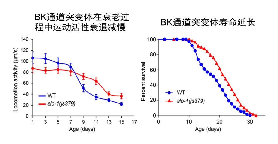 该团队延续2013年研究揭示的神经肌节点功能的减弱在运动功能衰退中作用的工作,首次利用遗传学以及药物学干预的方法,发现阻断BK通道(SLO-1)能够增强神经肌节点中神经递质的发放,从而起到减缓线虫运动功能的衰退过程。与此同时,遗传学和药物的干预阻断SLO-1也能延长线虫的寿命。进一步的研究表明类胰岛素信号通路(IIS)的下游DAF-16也于肠道中参与其中。由于BK通道通常在突触发放过程中起到调控作用,该研究为哺乳动物的运动以及衰老研究提供了一种思路: BK通道或许能参与调控高等生物的衰老过程。