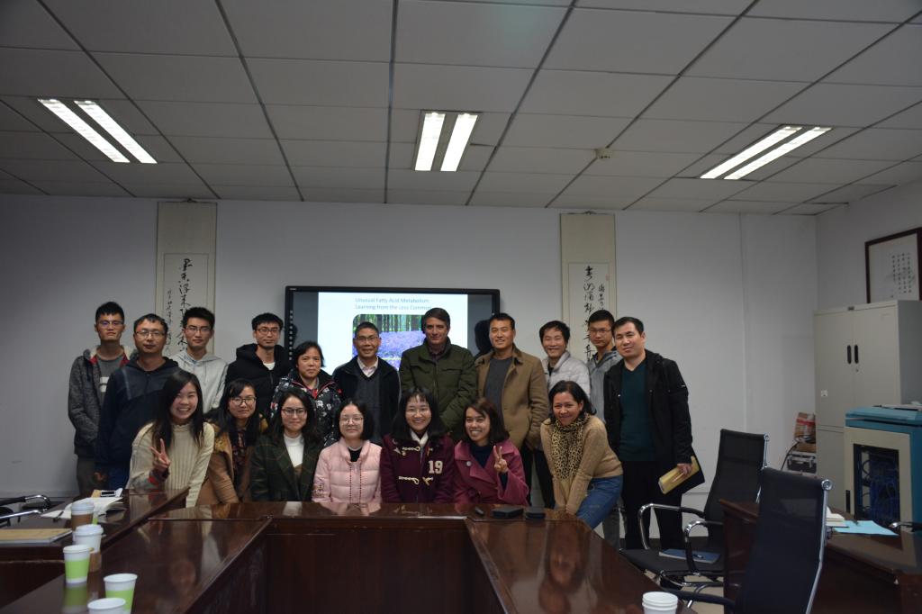 Edgar Cahoon教授的报告题目为“Unusual Fatty Acid Metabolism: Learning from the Less Common”,详细介绍了两种在诸葛菜中新发现的特殊脂肪酸7,18-(OH)2-24:1和7,18-(OH)2-24:2的结构、抗摩擦性能及基因表达调控。由于这两种特殊脂肪酸分别是由位于中国武汉研究者和位于内布拉斯加大学研究人员共同发现的,故分别命名为武汉脂肪酸和内布拉斯加脂肪酸。Edgar Cahoon教授讲述了通过分子生物学手段揭示了该特殊脂肪酸形成的代谢途径的过程和相关的基因表达调控。本次学术交流为植物脂肪酸的生物合成和代谢以及新的特殊脂肪酸提供的挖掘打开了新的思路和技术方法。