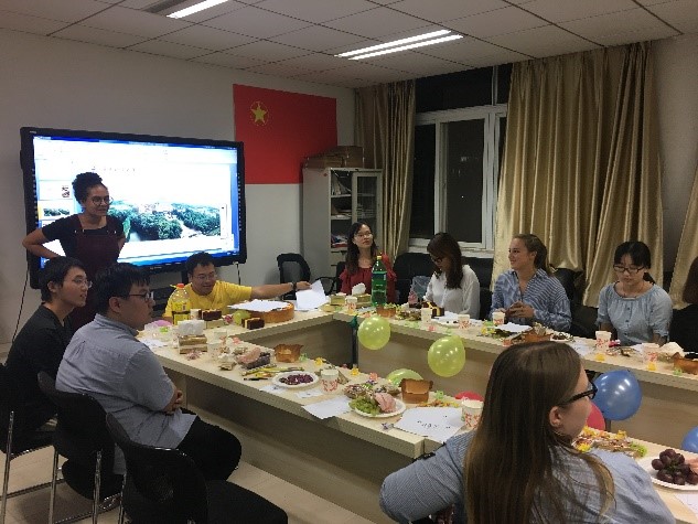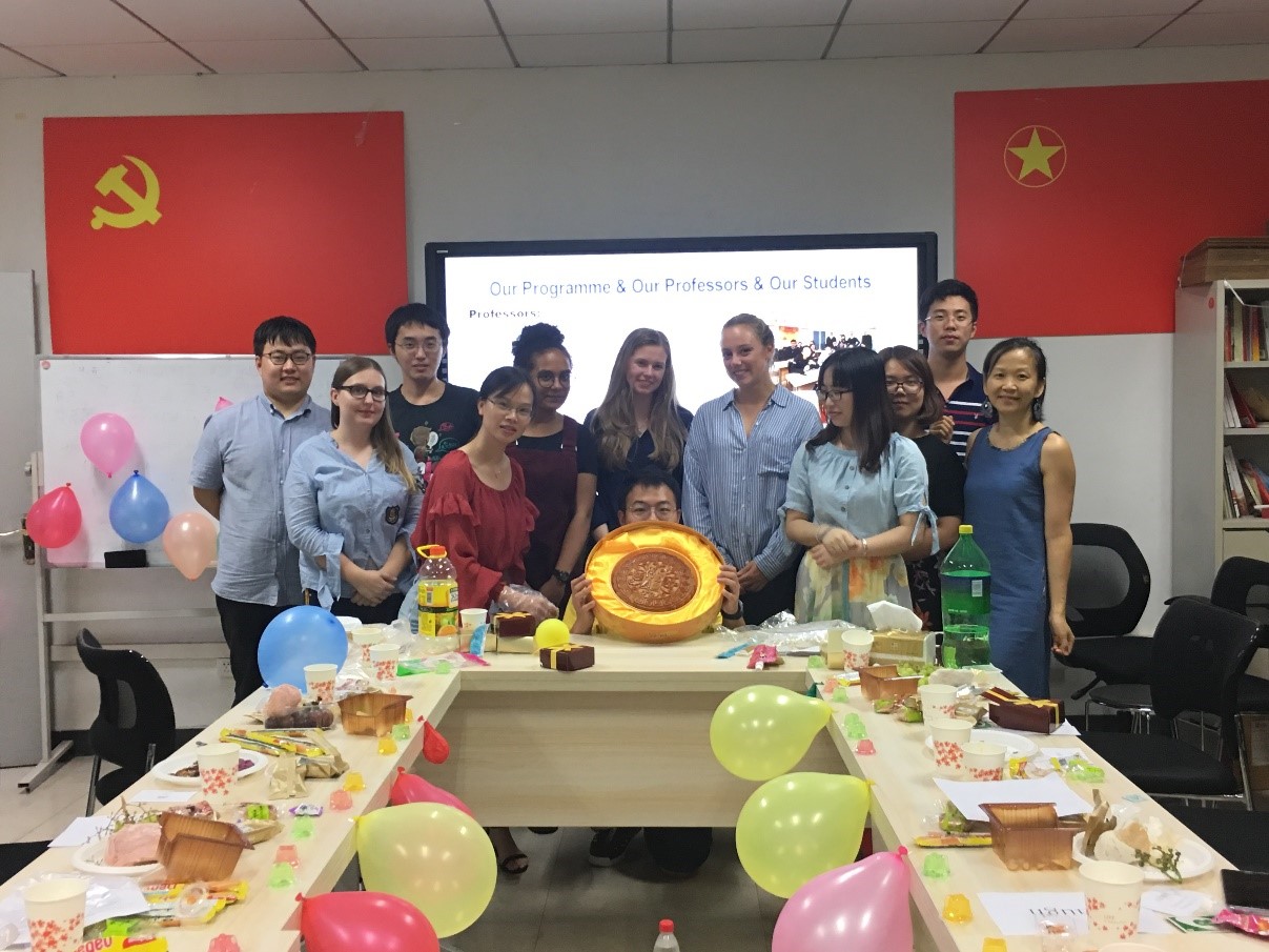 At the beginning of this party, all the participants introduced themselves and then our Chinese students explained the meaning of the Mid-Autumn Festival. We prepared different types of mooncakes for everyone and a huge one which means the union of whole family. It's quite impressive for having such a welcome party in a Chinese traditional festival, full of festive atmosphere balloons at elaborately decorated room, an extremely huge moon cake, interesting games, and funny jokes. Our all students come from non-English speaking countries. Celebrating together and playing games in English was a really good experience to deepen the exchange among students. This was also the occasion to gather all students and learn more about each other. After one week being in China, our Frenches students really appreciated this initiative. Everything is so novel and this was undoubtedly an unforgettable memory for everyone. This time, the party is hold for Chinese traditional festival, next time will be in Paris. We truly hope that the students take advantage of this opportunity and more students will join us in the future.