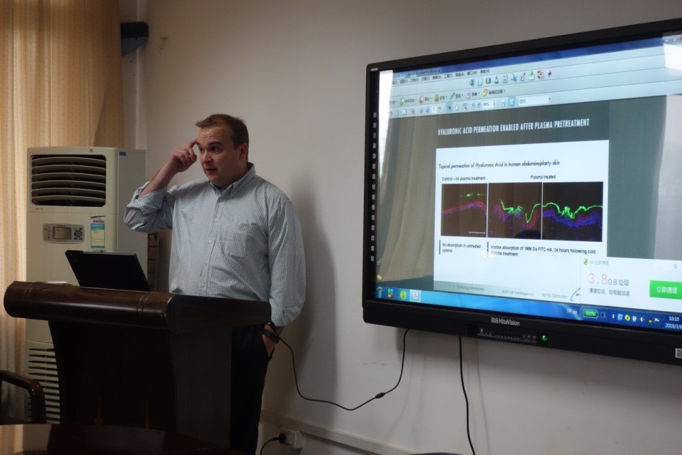 David Hale 先生在报告中提到,低温等离子体在处理皮肤时,能够使皮肤表面形成微通道,通过此通道,大分子药物可以渗透入皮肤,达到治疗或美容的效果。以玻尿酸美容为例,相比与传统的注射疗法,等离子体美容技术有着无痛,无需注射,使用门槛低,疗效快速持久的优点,这使得低温等离子体美容技术有着广泛的应用以及市场前景。David Hale的报告后,就等离子技术应用的安全性等相关性进行了热烈的讨论。接着,何光源教授对本实验室的研究方向、研究背景,以及具体研究内容以PPT的形式进行了简要的介绍。
