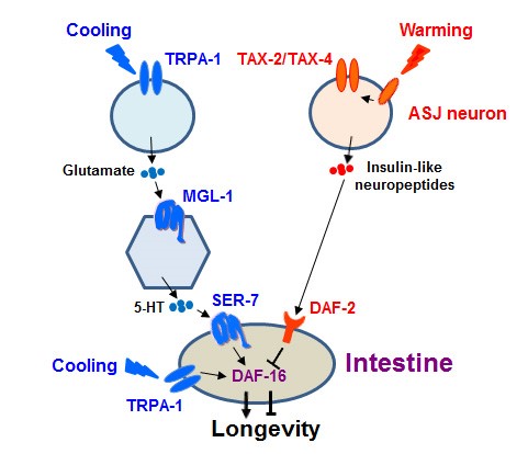该工作首先发现线虫IL1神经元感受低温刺激后,通过谷氨酸及5-羟色胺小分子神经递质分泌信号通路显著地增强线虫肠道内促长寿因子DAF-16/FOXO的转录活性,进而实现了延长线虫寿命的作用。同时,该工作还鉴定发现线虫ASJ神经元感受较高温度刺激后,通过分泌胰岛素及胰岛素类似神经肽作用于线虫肠道上的胰岛素受体同源蛋白DAF-2并抑制肠道细胞内DAF-16/FOXO转录活性,从而缩短线虫的寿命。有意思的是,该项工作发现:抑制高温感受神经元分泌的神经肽信号可以促进DAF-16/FOXO转运进入细胞核进而增强其转录活性;而低温诱导的小分子神经递质信号通路则直接增强细胞核内DAF-16/FOXO的转录活性进而延长线虫寿命; 另外,肠道细胞接受到神经系统信号后,还可以将相应信号‘辐射’到其他组织,协同调控生物个体的衰老及长寿过程。该项研究系统地揭示了温度通过神经感受系统调节调控线虫肠道内‘长寿因子’的活性进而影响线虫衰老及寿命的精细机制,鉴定了线虫新型低温感受相关神经元,确认了神经感受系统传递温度刺激的细胞间神经分泌信号通路,同时揭示了不同温度刺激具有差异性调控促长寿转录因子活性的机制。