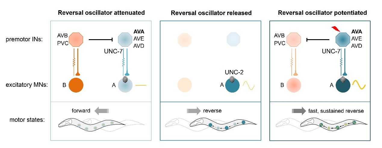 该研究论文从神经环路功能机制上解析了A运动神经元依靠UNC-2产生自发节律震荡活性,控制后退运动的新调控机制(下图5)。