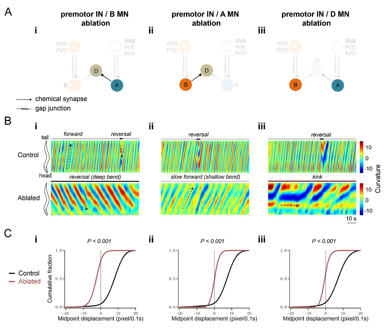 高尚邦课题组与加拿大多伦多大学Lunenfeld-Tanenbaum Research Institute Mei Zhen教授实验室合作,利用一个光敏感杀伤蛋白miniSOG 【2】,特异杀死运动神经环路中不同组分神经元,发现,去除所有中间神经元和兴奋性B运动神经元后(只剩下兴奋性A运动神经元和抑制性D运动神经元),线虫仍然有效执行后退运动,提示兴奋性运动神经元能够单独支配运动的发生(下图3),该实验结论与我们了解的一般动物(特别是哺乳动物)运动发生需要中间神经元产生中央节律发生器CPG活性完全不同,线虫运动发生需要运动神经元而非中间神经元。该研究结论在前期研究结果的基础上,进一步明确了运动发生的神经环路机制。