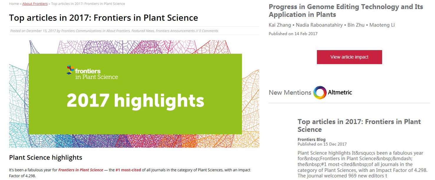 (通讯员 张凯)近日,前沿(Frontiers)杂志社公布了2017年度Top articles和Highlights,公司yl7703永利栗茂腾教授课题组于2月14日在Frontiers in Plant Science期刊上发表的的论文“Progress in Genome Editing Technology and Its Application in Plants” (基因组编辑技术研究进展及其在植物研究中的应用)在本年度发表的2100多篇文章中脱颖而出,被选为Top articles(共有10篇文章入选),并被作为highlights文章推荐。在本文正式发表的10个月内的浏览量近5800次,下载量超过1600次,受到国内外专家的广泛关注。本文第一作者为博士研究生张凯同学,栗茂腾教授为通讯作者,Nadia Raboanatahiry博士后和朱斌教授也参与了本篇文章的撰写。Frontiers in plant Sciences期刊的2016年影响因子为4.298,在PLANT SCIENCES领域2012种期刊中处于前10%。