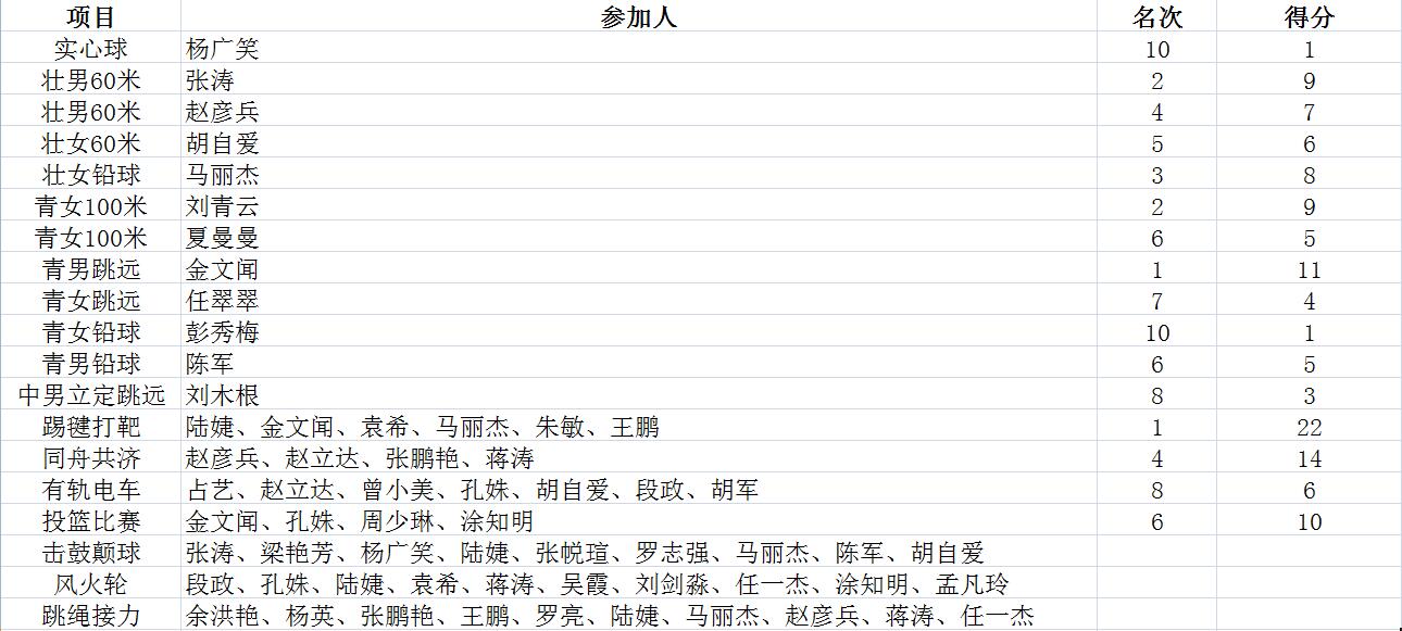 (通讯员:朱庆红 郭家涵)“碧云天,黄叶地,秋色连波,波上寒烟翠”,秋天是收获的季节,也是运动的季节,在这秋高气爽的日子里,校运动会如期举行。公司师生运动健儿齐上场,奋勇争先,取得了教工甲组团体总分第4名,研究生甲组团体总分第4名,本科生甲组团体总分第2名的好成绩。