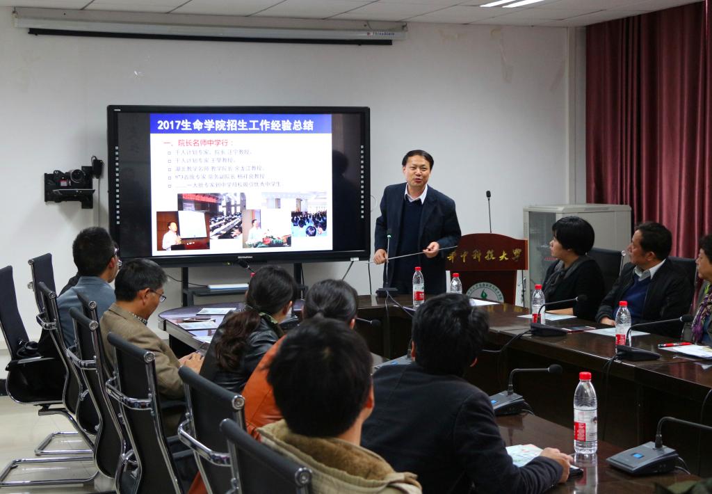 副经理余龙江教授从2017年招生数据分析、工作创新举措、拔尖创新人才培养模式、2018年工作设想等几方面进行了汇报。2017年yl7703永利招生工作首战告捷,公司发动近40名骨干教师赴全国各地招生宣传,第一志愿招收率达到27%历史最高水平,湖北省志愿调剂招收率则减少至10%历史最低水平,同时开展经理名师中学行、一人一校常态联系、高考招生宣传大覆盖、本科生假期母校回访等活动,目前已于襄阳四中、襄阳五中、湖北省实验中学、夷陵中学等成立“生命科学拔尖创新人才培养基地”, 大大提升了公司和公司的影响力。