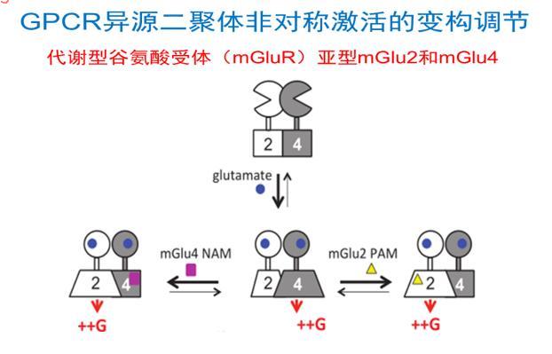 代谢型谷氨酸受体(mgluR)是重要神经递质谷氨酸的G蛋白偶联型受体,分为8个不同的亚型,是重要的药物靶点。 mGluR可以形成同源二聚体,近年来,有越来越多的证据发现mGluR不同亚型也可以形成异源二聚体,从而具备了全新的药理学特性,其激活机制还不清楚。采用mGluR作为研究对象,研究团队发现,mGluR的两种亚型mGlu2单体和mGlu4单体在各自的同源二聚体中,都拥有结合偶联G蛋白的能力。但是在mGlu2-4异源二聚体中,却只有mGlu4的单体偶联G蛋白,mGlu2的单体在竞争中失去该功能,展示出一种非对称的信号传导现象。进一步研究发现,这种不对称的激活现象是可调节的,在mGlu2-4异源二聚体中,当利用mGlu4的负向变构剂增加mGlu4单体激活的能垒或者利用mGlu2的正向变构剂降低mGlu2单体激活能垒时,mGlu2可以很好的恢复偶联G蛋白的能力。该研究揭示了GPCR异源二聚体中的可以调控的导向性的非对称激活现象,为研究GPCR异源二聚体的激活机制以及开发出以GPCR异源二聚体为靶点的药物开发提供了新的思路。