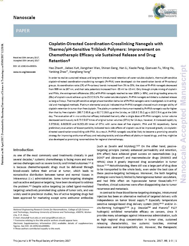 (通讯员 徐家宝)2017年4月4日,英国皇家化学会旗下期刊《Nanoscale》(影响因子7.76)在线发表了公司yl7703永利国家纳米药物工程技术研究中心的独立研究成果:“Cisplatin-Directed Coordination-Crosslinking Nanogels with Thermo/pH-Sensitive Triblock Polymers: Improvement on Chemotherapic Efficacy via Sustained Release and Drug Retention”。2016级研究生赵浩和生物制药专业2014级本科生徐家宝为本论文的共同第一作者,杨祥良教授和赵彦兵副教授为共同通讯作者。这一工作通过温度/pH敏感聚合物与水溶性化疗药物顺铂自组装,解决了水溶性药物体内快速代谢、滞留时间短的难题,从而极大地提高其肿瘤治疗效果。
