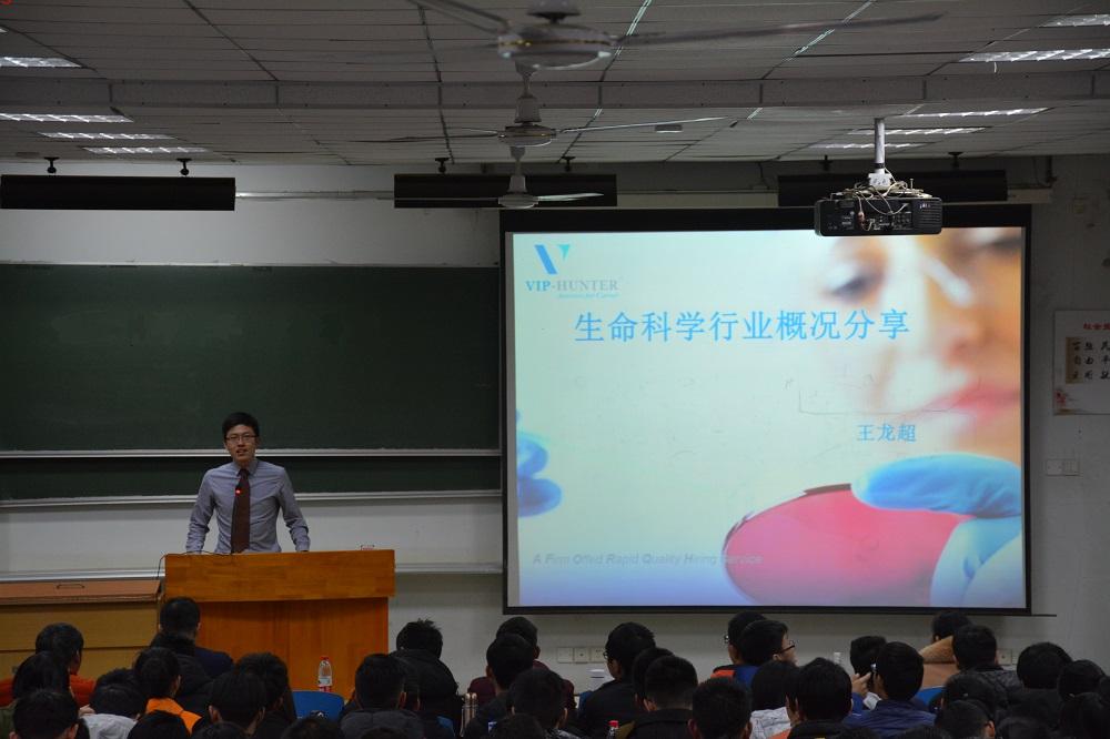 在同学们热烈的欢迎中,王龙超经理以生命的定义为切入点正式开讲,他分别从国家十三五科技创新规划、武汉光谷生物城的发展、资本市场对生命方向的投入等方面突出生命行业在二十一世纪的重要性。针对于同学们对于未来就业问题的关心,王经理分别就不同专业的特点介绍了对应的国际国内知名企业,并指出这些企业的基本要求,以举例的方式生动地展示了生命行业就业渠道之宽广。最后王龙超嘉宾以赛默飞世尔公司为例,讲解了公司的各部门组成,并对不同岗位的不同特点进行了介绍。