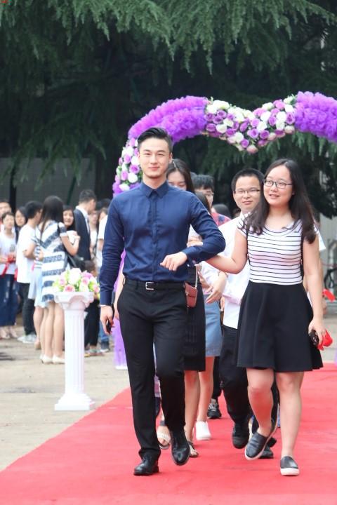 在毕业典礼正式开始之前,首先进行的环节是毕业生们以班级为单位从拱门走红毯入场,并在留言墙上签名。在动听的毕业歌曲的伴奏以及主持人精彩的解说下,各班级先后完成了红毯秀,在走红毯环节既有帅气成熟的男生,也有娇美动人的女生,既有华科特色的基友党,也有艳羡众人的情侣cp党。