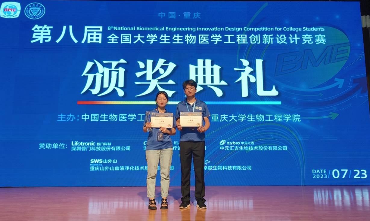 由蔡超老师指导,郭安欣、沈瑞、吴春阳等同学完成的项目《基于ANC耳机声学传感的可穿戴心音检测系统》;胡军老师指导,陈雪、宋成、吴美婵等同学完成的项目《工程化益生菌肿瘤原位药物合成增强光热联合免疫治疗》分别荣获一等奖。由刘笔锋老师指导,李顺基、刘景轩、章英等同学完成的项目《基于离心式微流控技术的高通量酶联免疫分析系统》;邱武老师指导,李锦鹏、黄彦玮、王杨婷婷等同学完成的项目《基于深度学习的CT增强影像侧枝循环自动评分》;丁明跃老师指导,张以祥、申伯阳、王昊等同学完成的项目《乳腺UCT图像识别》;王植炜老师指导,邱天、谢高翔、张嘉乐等同学完成的项目《穿戴式心电图 ST 段改变的识别》分别荣获二等奖,公司另有7支队伍荣获大赛三等奖。