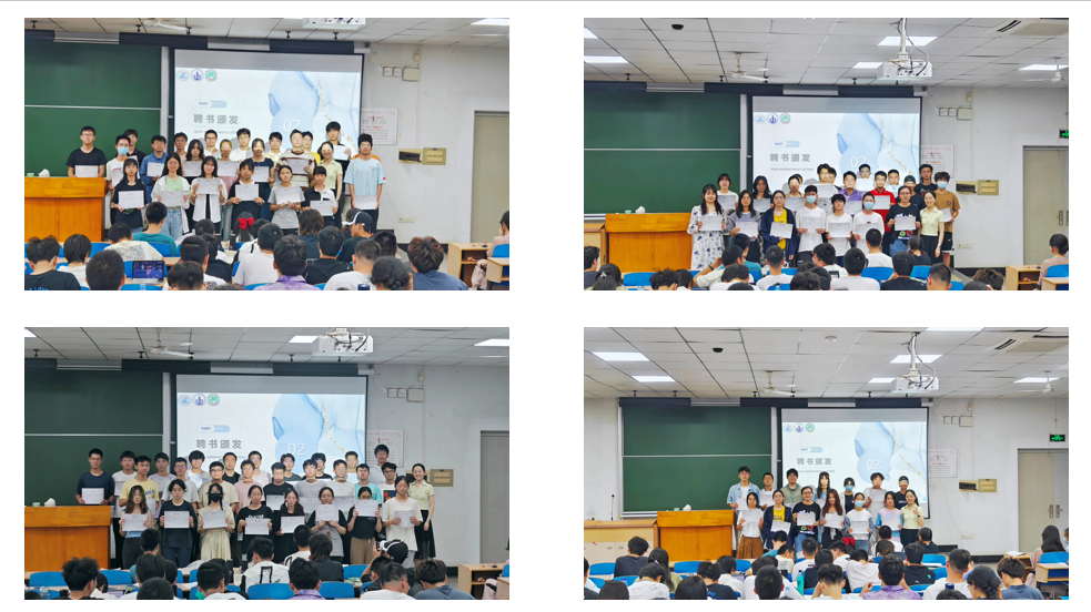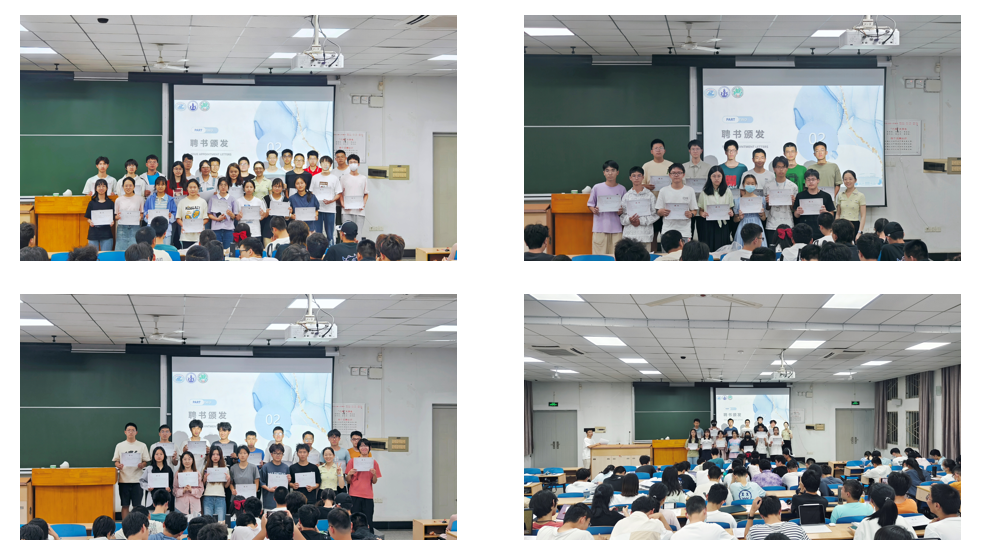 进入聘书颁发环节。班委们按照分工依次上台,由蒋老师颁发聘书,并拍照合影留念。班委聘书是对各位班委一学年来努力工作的证明和肯定,也是对未来员工工作的鼓舞与激励。