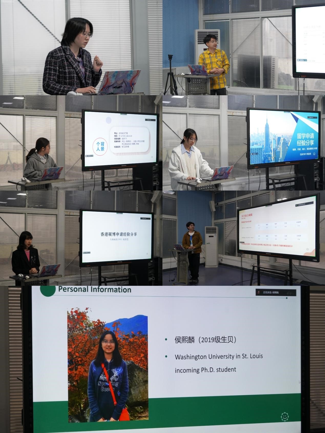 生科1901班肖晗宇同学、生卓1901班骆意同学、生医1902班潘澳同学、生科1901班李佳奕同学、生贝1901班侯熙麟同学、生药1901班赵佳艺同学以及生医1901班常续本分别就北美地区、北欧地区和香港等地的申请策略,雅思学习思路和方法,考研后选择留学等方面进行了分享。多名在国外深造的学长学姐们通过视频向同学们分享了留学经历。活动最后向在场的同学们发放了2023年留学手册,为生命学子留学交流提供参考,让同学们未来发展有了更多的认知。