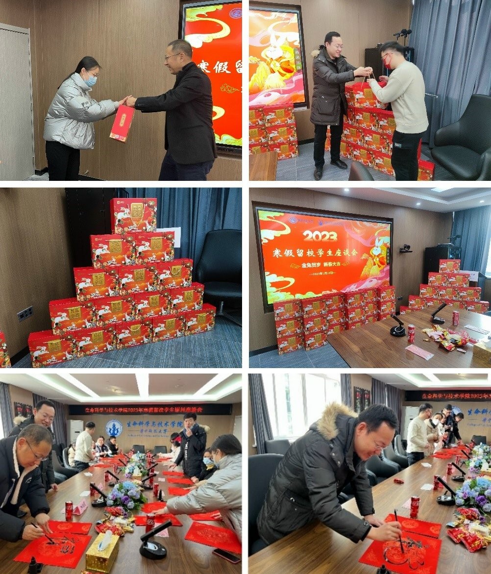 与会老师和员工们一起用纸墨书写下新年的美好心愿与祝福。挥笔写下“福”字,祝福公司在新的一年取得进一步的发展,同时更是祝愿同学们新的一年大展宏图,在科研和生活各方面都能事事顺心、收获满满。座谈会最后,公司领导为留校员工送上了慰问物资,并致以新春的美好祝福。