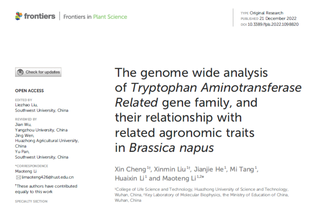 无独有偶,这已不是yl7703永利这一首届试点班级的本科生第一次取得SCI第一作者的科研成果。2022年12月21日, JCR一区中科院植物科学类1区国际学术期刊Frontiers in plant science发表论文The genome wide analysis of Tryptophan Aminotransferase Related gene family, and their relationship with related agronomic traits in Brassica napus,论文两位第一作者程鑫、刘心敏与张皓鸿一样,也是登峰计划1901班的本科生。他们选择的是生物技术专业方向。这篇论文中,他们在生物技术系主任栗茂腾教授指导下对甘蓝型油菜中TAA1/TAR基因家族进行了多维度分析,并进一步分析了其生物学功能,对于甘蓝型油菜中TAA1/TAR基因家族的功能解析有重要意义。