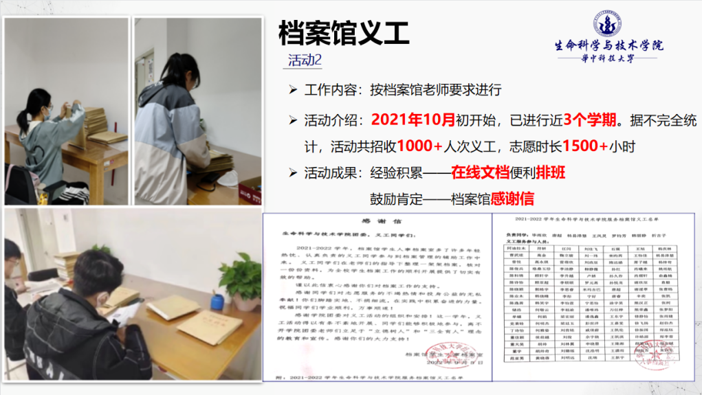 档案馆义工活动主要包含检查在馆档案基本情况等基础工作,志愿服务时长累计1500+小时,不仅有效地提高了同学们的档案意识,更增强了责任心和细致度。上学期末,公司团委收到了来自档案馆老师的感谢信,这既是对部门工作的肯定,更是对一直以来积极参与义工的同学们的称赞与鼓励。