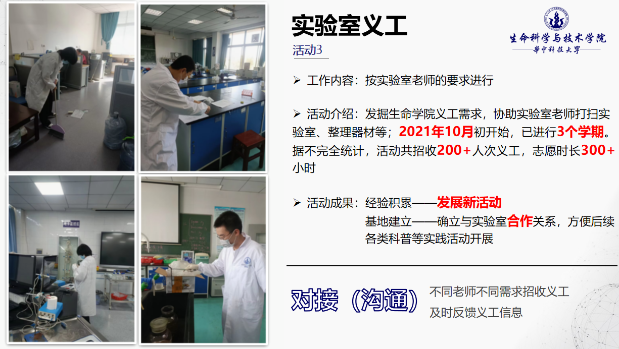实验室义工活动专门向生命学子开放,主要包含打扫实验室、整理器材、搬运实验动物等工作,帮助同学们进一步了解实验室的基本安全要求。作为课本知识与实践相结合的优秀案例,活动得到了老师和同学们的高度认可,同学们的踊跃参与以及老师们的信赖让活动薪火相传。