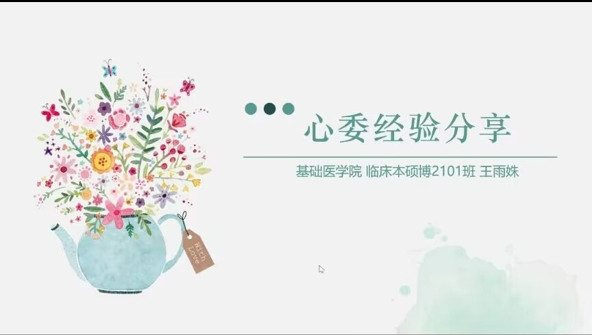 在优秀心委分享环节,21级王雨姝学姐分享了她在大一时开展的工作,比如考前班会、与其他班级联谊开展“新生工作坊”、寒假主动进行问候等,并谈及自己的工作感受,尤其是如何处理压力与探寻自我等方面。21级王语晴学姐谈到了如何使“心理晴雨表”更有温度、如何在疫情的大背景下关注同学们的心理状态等等。