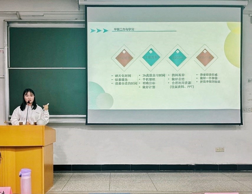 在优秀学委经验分享环节中,生实2001班尹睿思提出,学委作为师生之间信息沟通的重要桥梁,不仅要会对繁杂的信息进行整理更新,还要主动加强沟通。