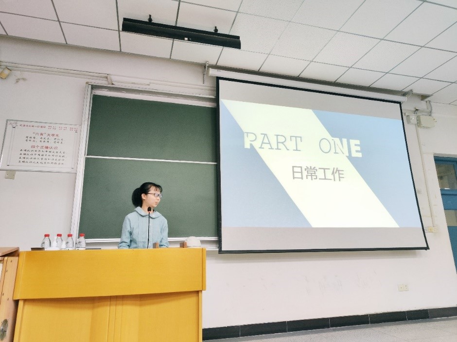 生信基地2001班学委瞿明月将职务工作进行了分块展示,鼓励各位新生学委主动贴近同学们的学习生活,用热情和真心开展工作。