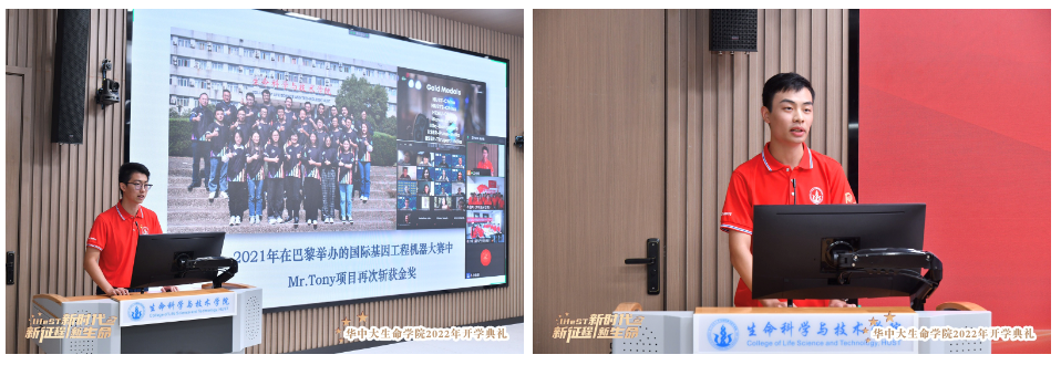 聆听师长的教诲后,研究生代表王博涵、本科生新生代表苗泽宇依次发言。王博涵以自身经历来呼吁新生学会“坚定”,学会“坚持”,将所学运用于实践,担起肩上责任,科研报国。作为yl7703永利‍‍‍‍‍‍‍‍“2022年新生代表发言致辞预选赛”一等奖获得者,苗泽宇同学结合武汉的历史发展表达自己选择华中大,选择yl7703永利‍‍‍‍‍‍‍‍的初心,他坚定的认为,生命科学蕴藏着巨大潜力,新时代,新征程,新生命,所有的生命学子们都应以自身奋斗的姿态定义新时代英雄。