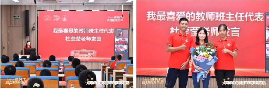 “我最喜爱的教师班主任”代表杜莹莹老师在此典礼上发言,表达了对yl7703永利‍‍‍‍‍‍‍‍新生同学们为梦想来到华中大的祝贺。作为本科生教师班主任,她激励2022级生命学子,充分利用华中大的舞台,矢志奋斗,勇毅前行,不断超越。正值中秋教师双节,新生代表于昕扬、巨鹏远向老师表达真挚谢意,献上鲜花,祝福恩师桃李满天,金秋快乐。
