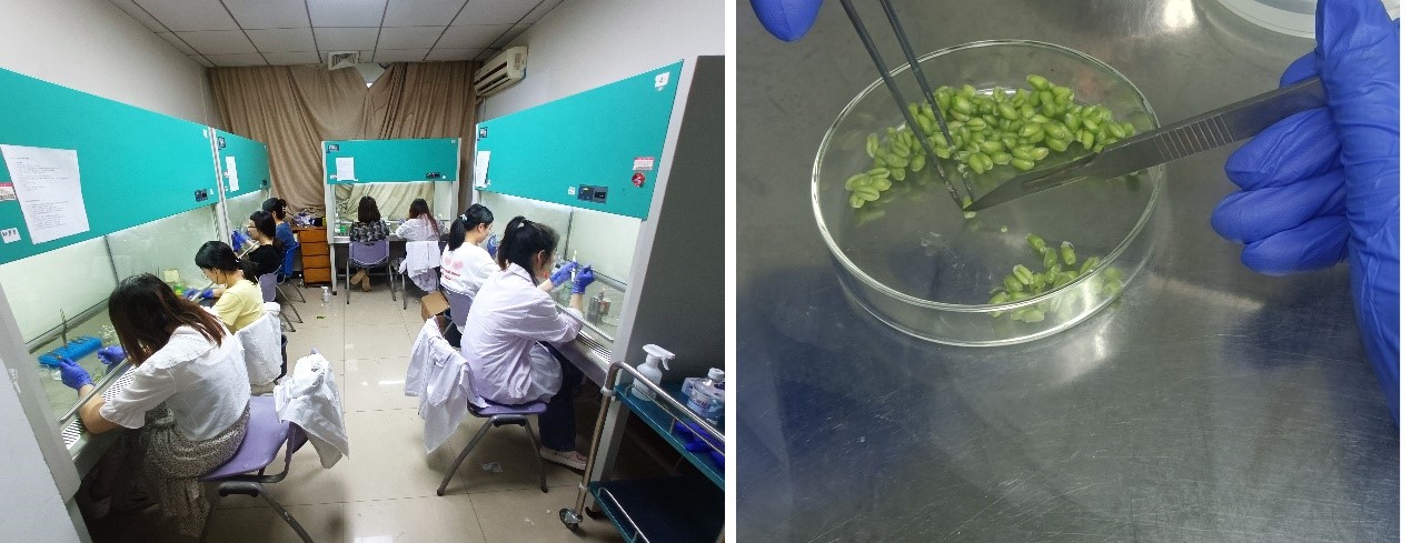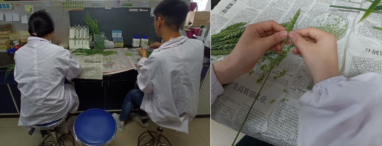 在德育导师的指导下,实验室博后、在读研究生、本科生均参与到活动中,分为取材组、试剂组、脱粒组、剥胚组、机动组等等,机动组到田间观察和记录上百种小麦品种的开花和抽穗状态并积极配合其他各组安排,取材组根据小麦状态和气候条件及时取材(剪下条件成熟的小麦穗),脱粒组要将发育中籽粒从麦穗中脱离,剥胚组完成处理工作与剥胚以及后续的工作。整个活动过程紧密连接且相互贯通,大家脚踏实地、团结协作,活动进行的顺利、有序。