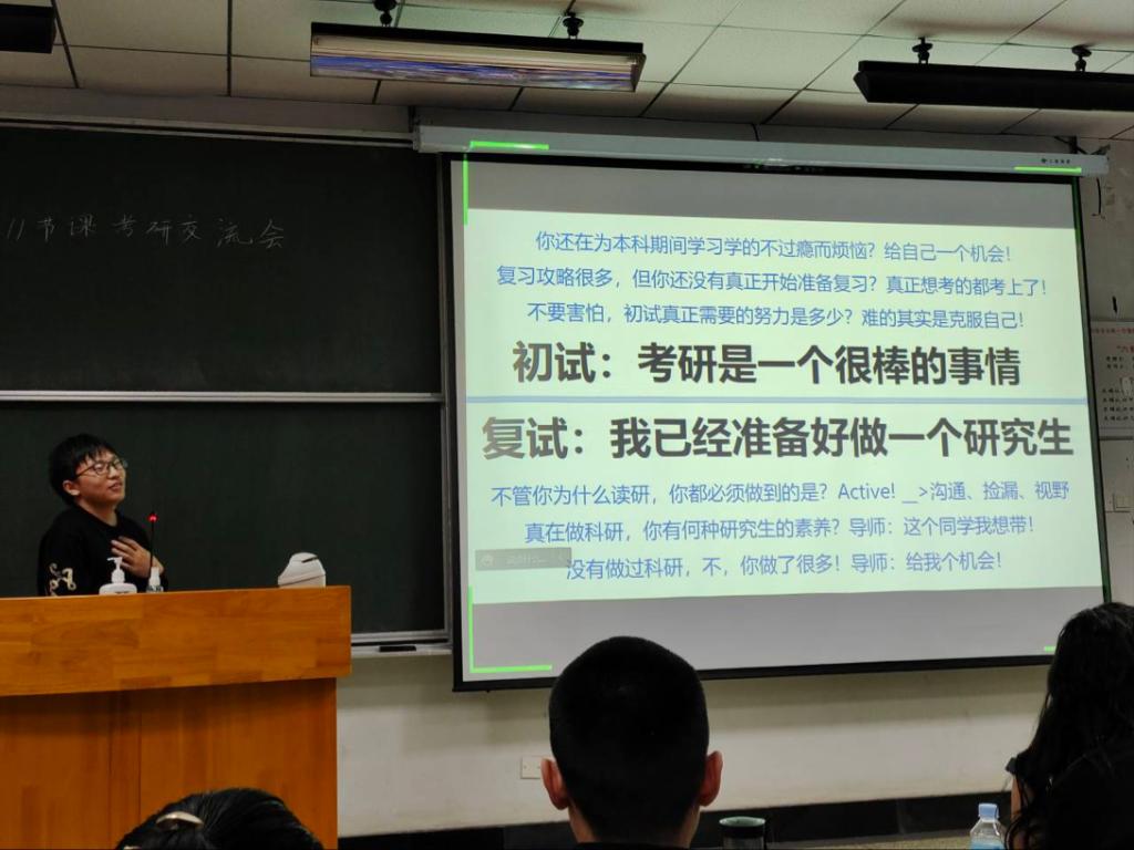 生物技术1801班刘志强学长以自身备考经历为主线,详细介绍了复习日程、时间安排、复试准备,对比了保研、考研、留学的收获和不同特点;生物制药1801班李蓓蓓学姐从数学、政治学习资料推荐和备考心态等方面进行了分享;生物医学1801班白佳欣学长建议大家主动和老师沟通找到心仪的科研方向和导师;生物技术1801班赵新元学长鼓励大家找到适合自己的学习方法和放松方式,多总结交流以保证学习效果。