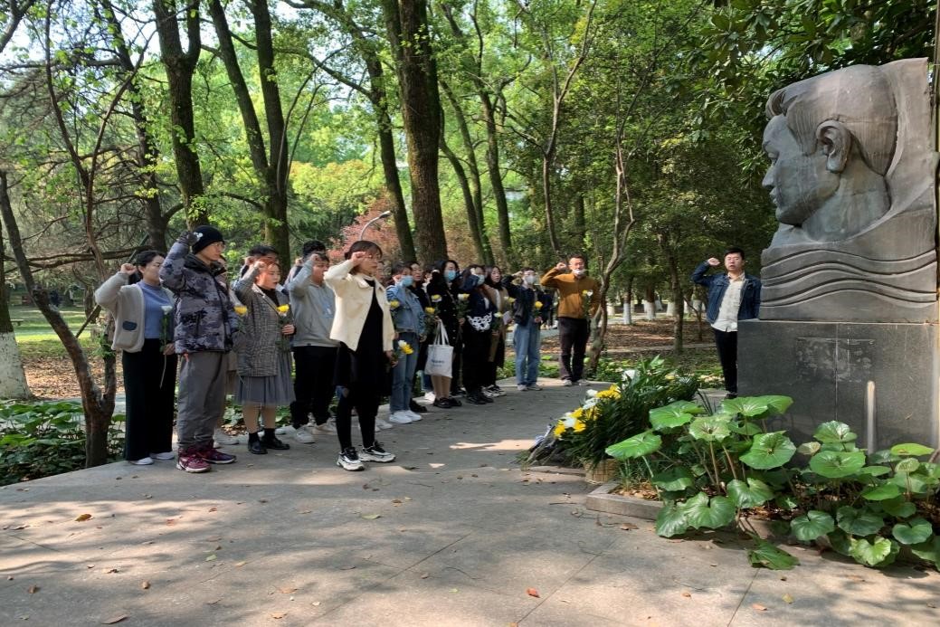 祭扫活动由党建中心宣传部工作人员吴秋晗主持,活动第一项,全体成员向胡吉伟塑像默哀一分钟,寄托对胡吉伟学长的深切哀悼和无尽的敬仰之情。2021级生物科学贝时璋菁英班的入党积极分子代表杨晨同学介绍了胡吉伟同员工平及勇救落水儿童的事迹,并呼吁广大生命学子继续传承胡吉伟精神,牢固树立正确的世界观、人生观、价值观,为华中大建设添砖加瓦,为实现中华民族伟大复兴贡献青春、智慧与力量。斯人已逝,精神长存,全体成员手持鲜花,瞻仰胡吉伟纪念雕像,并上前为胡吉伟塑像献花,寄托对英雄员工的哀思。