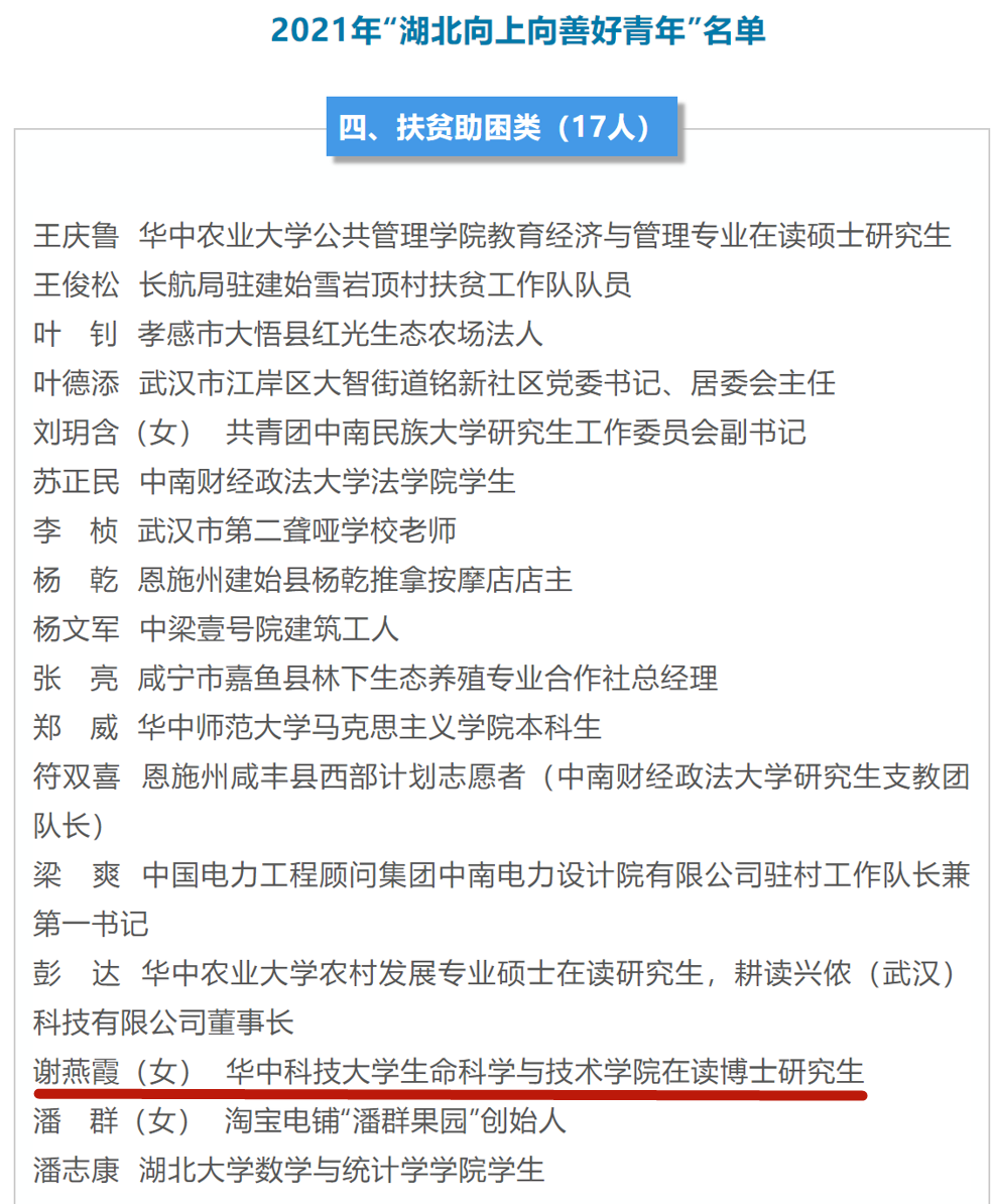 近日,团省委公布了2021年“湖北向上向善好青年”名单,其中公司研究生谢燕霞同学获2021年“湖北向上向善好青年”荣誉称号。