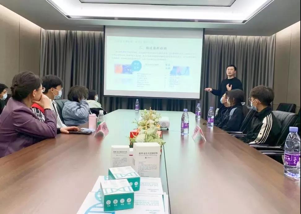 在美益添生物医药公司,运营总裁王舒先生首先他结合了自身的学习经历和工作经验对同学们未来的发展方向进行了指导,并介绍了公司研发和运营的方向,让同学们见识了肠道微生物菌群对人健康的重要影响。随后在王舒带领下参观了公司的研发中心,进一步了解了肠道微生态及公司的目标与方向。
