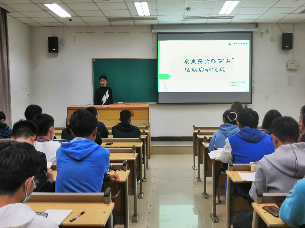 2020年11月8日晚7点,2018级辅导员周钰老师、2018级员工会生活服务部付翔飞、樊昌鑫以及2018级各个寝室的寝室长共同参加了在东九D114举行的以“强化安全教育,构建文明寝室”为主题的寝室安全教育月活动启动仪式。