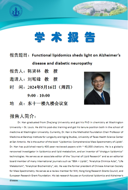 Dr. Han graduated from Zhejiang University and got his PhD in chemistry at Washington University – St. Louis. He did his post-doc training and got his tenure position both in the school of medicine at Washington University. Currently, Dr. Han is the Methodist Foundation Chair Professor of Medicine at Barshop Institute for Longevity and Aging Studies, University of Texas Health Science Center at San Antonio. He is the author of the book “Lipidomics: Comprehensive Mass Spectrometry of Lipids”. Dr. Han has published nearly 400 peer-reviewed papers with ~ 40,000 citations. He is a globally renowned investigator in lipidomics and lipid metabolism, and an inventor of “shotgun lipidomics” technologies. He serves as an associate editor of the “Journal of Lipid Research” and as an editorial board member of many international journals such as “BBA – Lipids”, “Analytica Chimica Acta”, “Life Metabolism”, “Analytical Biochemistry”, etc. He was the former president of Chinese American Society for Mass Spectrometry. He serves as a review member for NIH, Hong Kong Research Grants Council, and European Research Grant Foundation. His lab research focuses on functional lipidomics and Alzheimer’s disease.