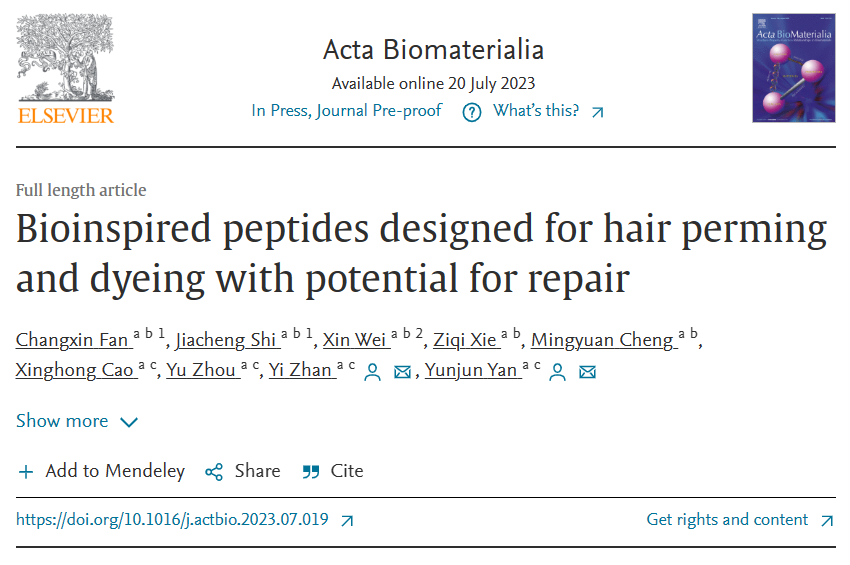 (通讯员 石家诚)7月21日,生命科学与技术创新基地本科生创新团队iGEM HUST-China在生物材料领域国际知名学术期刊《Acta Biomaterialia》(IF=9.7,JCR分区Q1)上成功发表题为“Bioinspired peptides designed for hair perming and dyeing with potential for repair”的论文(用于烫发染发并具损伤修复潜力的仿生多肽)。这是该本科生创新团队将自主科研创新参赛成果进一步整理,在前期完成发明专利申请“一种染发剂及其使用发放、染发液、染发膏和染发梳(CN202211053748.9)”的基础上,产生的又一重要成果。