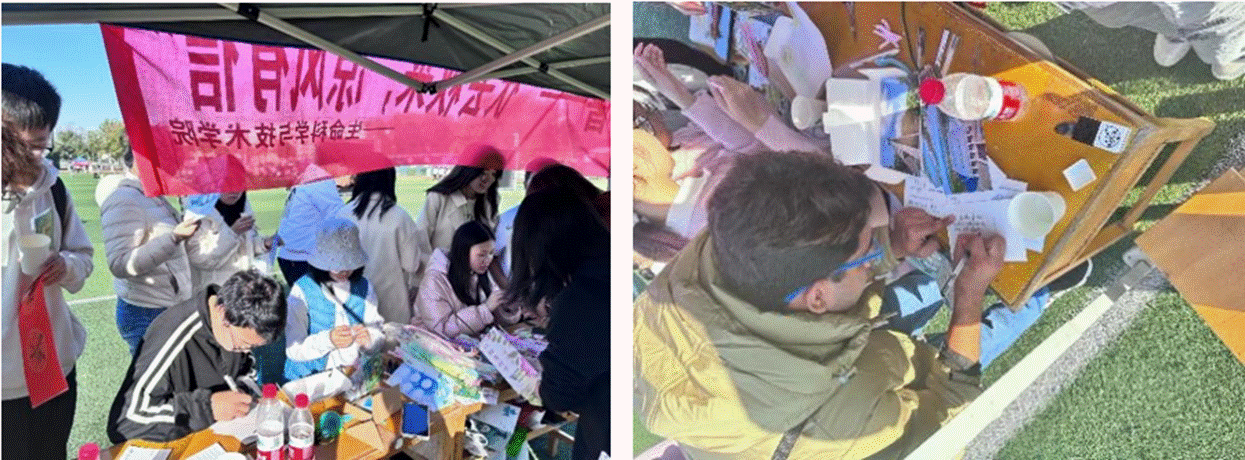 在纷繁的生活中静下来,用文字书写思念。“写信”活动最受现场同学们的喜爱,在40多张永利官网的明信片上,大家用文字承载着校园生活的满满幸福感,寄托着对美好未来的期待,展现出华科学子乐观向上,朝气蓬勃的生活态度。一位职工在明信片上用美丽的花体英文写下了一首秋天的小诗。此时,文字就如同秋日的暖阳一般,将温暖和思念传递给每一位收信人。