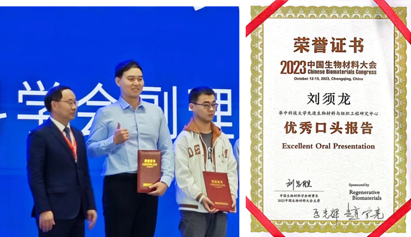 刘须龙(左二)荣获2023中国生物材料大会 “优秀口头报告奖”,赵宇亮院士(左一)为获奖者颁奖