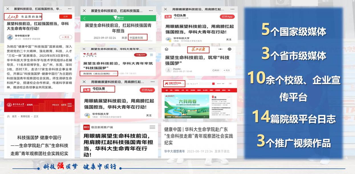 实践队形成《企业走访实录合集》13篇、《生命科学技术报告》13篇、《生命员工访谈合集》14篇、《实践纪实合集》40余段等文字材料,社会实践成果被中国青年网、中国老员工网报、人民号、头条号、企鹅号等国家级媒体报道,被湖北日报、楚天都市报、长江头条等省市级媒体报道,被10余个校级、企业等宣传平台报道,形成3个推广视频作品。