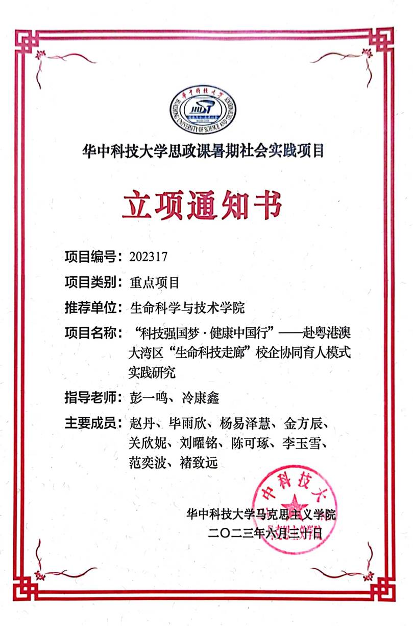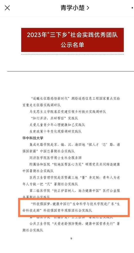 近日,为推进“三下乡”实践活动持续深入开展,充分发挥共青团组织在实践育人中的重要作用,经基层申报、各地各单位团组织推荐、组织评议等环节,团省委、省学联决定,对2023年“三下乡”活动中表现突出的单位、项目、团队、个人给予通报表扬。yl7703永利“科技强国梦,健康中国行”赴广东“生命科技走廊”科技强国青年观察团社会实践队荣获湖北省2023年“三下乡”社会实践优秀团队!